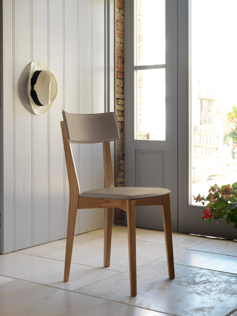 Moderna tapecirana stolica GINGER iz ponude FRIUL sedie, dimenzije Š 46 x V 84,5 x D 48,5 cm. Postolje masiv jasen, u razlicitim tonovima, sjedište tapecirano sa regeneriranom kožom.